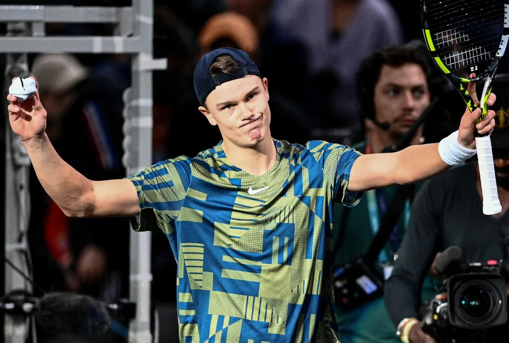 Denmark's Holger Rune celebrates after winning against Spain's Carlos Alcaraz Garfia at the end of their men's singles quarter-final tennis match on day 5 of the ATP World Tour Masters 1000 - Paris Masters (Paris Bercy) - indoor tennis tournament at The AccorHotels Arena in Paris on November 4, 2022.,Image: 735302552, License: Rights-managed, Restrictions: , Model Release: no