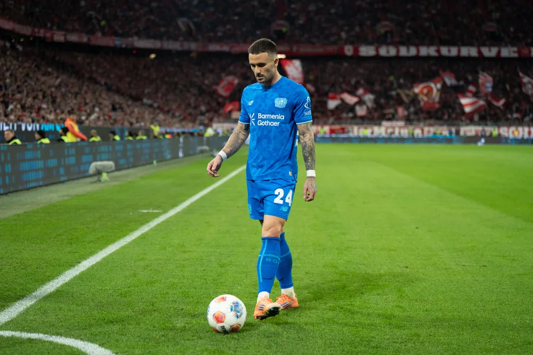 Aleix Garcia, de la Bayer Leverkusen, suteaza in timpul meciului de fotbal contra echipei FC Bayern Munchen, din etapa a 9-a a Bundesligii, disputat pe Allianz Arena din Munchen, sambata, 1 noiembrie 2025. MARC MARASESCU / MEDIAFAX FOTO