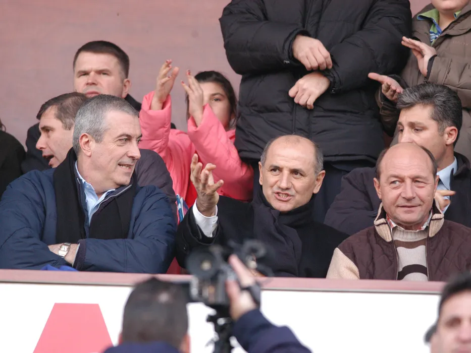 Calin Popescu Tariceanu, George Copos si Traian Basescu in tribuna la meciul de fotbal dintre Rapid Bucuresti si Hamburg SV, contand pentru Cupa UEFA, desfasurat pe Stadionul Giulesti-Valentin Stanescu din Bucuresti, joi 9 martie 2006. © FOTO:Razvan Pasarica/SPORT PICTURES