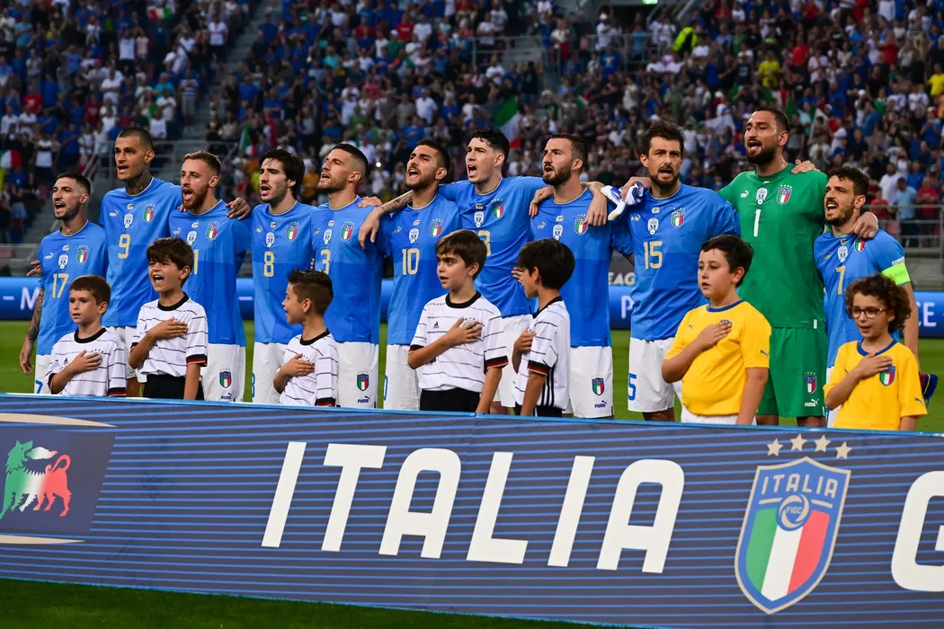 (From L) Italy's forward Matteo Politano, Italy's forward Gianluca Scamacca, Italy's midfielder Davide Frattesi, Italy's midfielder Sandro Tonali, Italy's defender Cristiano Biraghi, Italy's midfielder Lorenzo Pellegrini, Italy's defender Alessandro Bastoni, Italy's midfielder Bryan Cristante, Italy's defender Francesco Acerbi, Italy's goalkeeper Gianluigi Donnarumma and Italy's defender Alessandro Florenzi sing their national anthem prior to the UEFA Nations League - League A, Group 3 first leg football match between Italy and Germany on June 4, 2022 at the Renato Dall'Ara stadium in Bologna.,Image: 696961186, License: Rights-managed, Restrictions: , Model Release: no