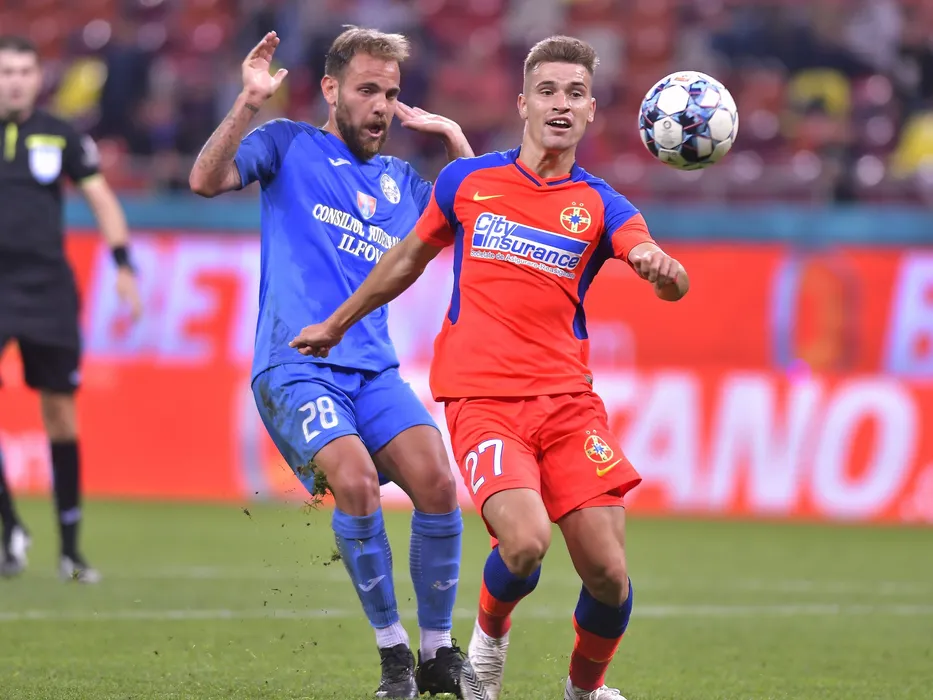 Juan Bautista Cascini si Darius Dumitru Olaru in meciul de fotbal dintre FCSB si Academica Clinceni, contand pentru Liga 1 Casa Pariurilor, desfasurat pe Stadionul Marin Anastasovici din Giurgiu, sambata 25 septembrie 2021. © FOTO:Razvan Pasarica/SPORT PICTURES