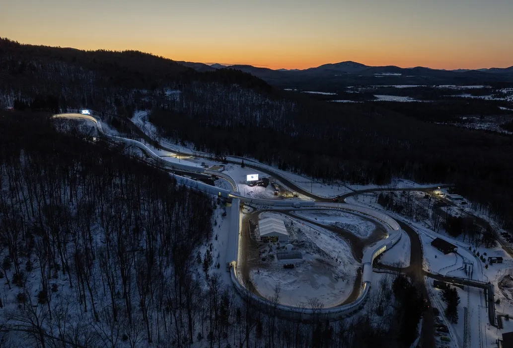 LAKE PLACID, NEW YORK - MARCH 08: In an aerial view, the sliding track is shown on Day 3 of the 2025 IBSF World Championships at Mt Van Hoevenberg on March 08, 2025 in Lake Placid, New York. Al Bello,Image: 973854441, License: Rights-managed, Restrictions: , Model Release: no