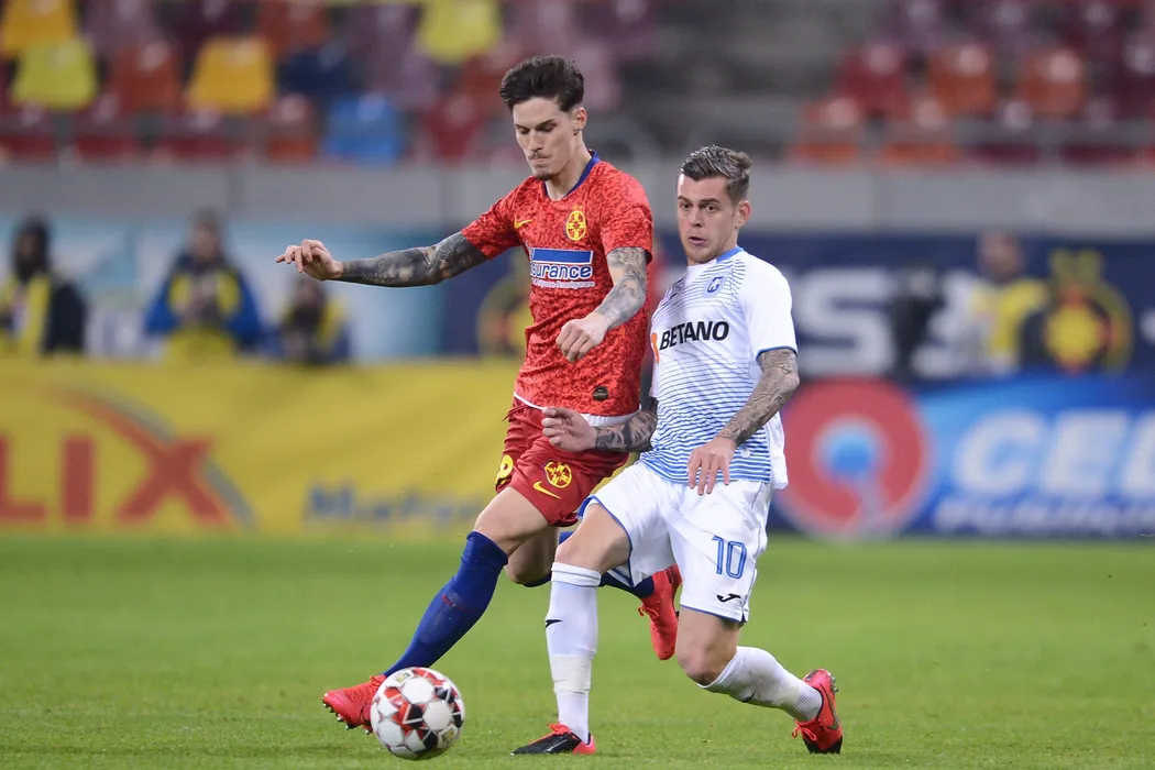 Dennis Man (S), de la FCSB, lupta pentru balon cu Alexandru Cicaldau (D), de la Universitatea Craiova, in timpul meciului de fotbal din etapa a II-a a play-off-ului Ligii 1, disputat pe Arena Nationala din Bucuresti, duminica, 8 martie 2020. ALEXANDRU DOBRE / MEDIAFAX FOTO