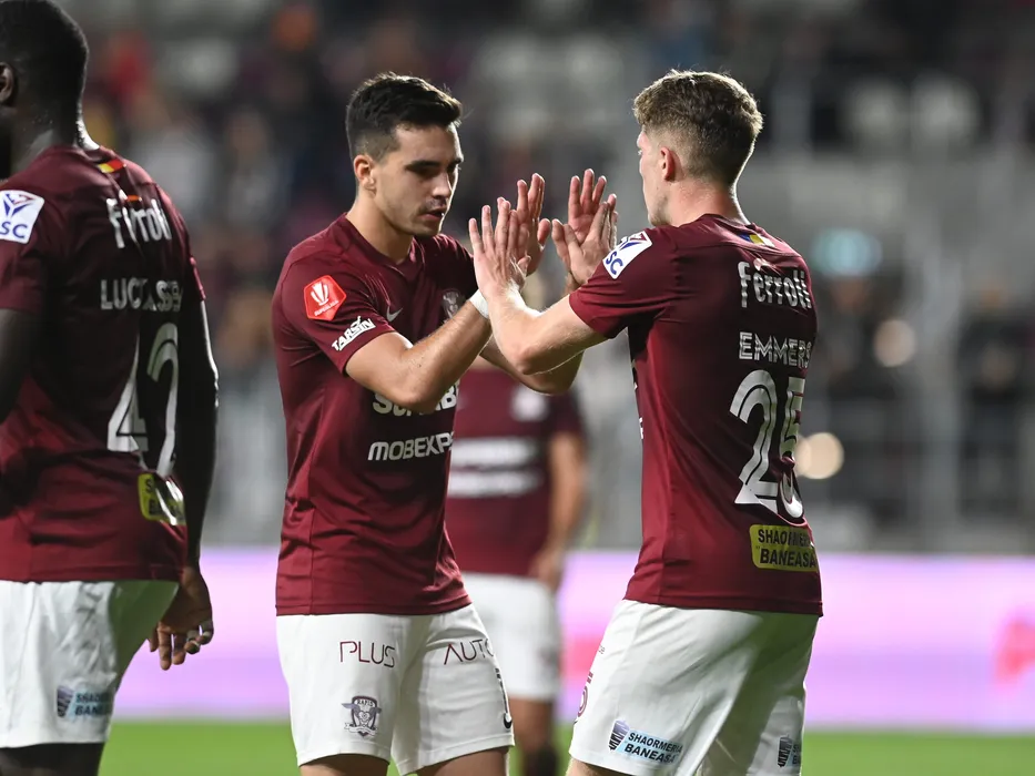 Stefan Calin Panoiu il felicita pe Xin Ghislaine R. Emmers dupa un gol marcat in meciul de fotbal dintre CS Afumati si Rapid Bucuresti, contand pentru Cupa Romaniei Timisoreana, desfasurat pe Stadionul Rapid Giulesti din Bucuresti, miercuri 28 septembrie 2022. © FOTO:Razvan Pasarica/SPORT PICTURES