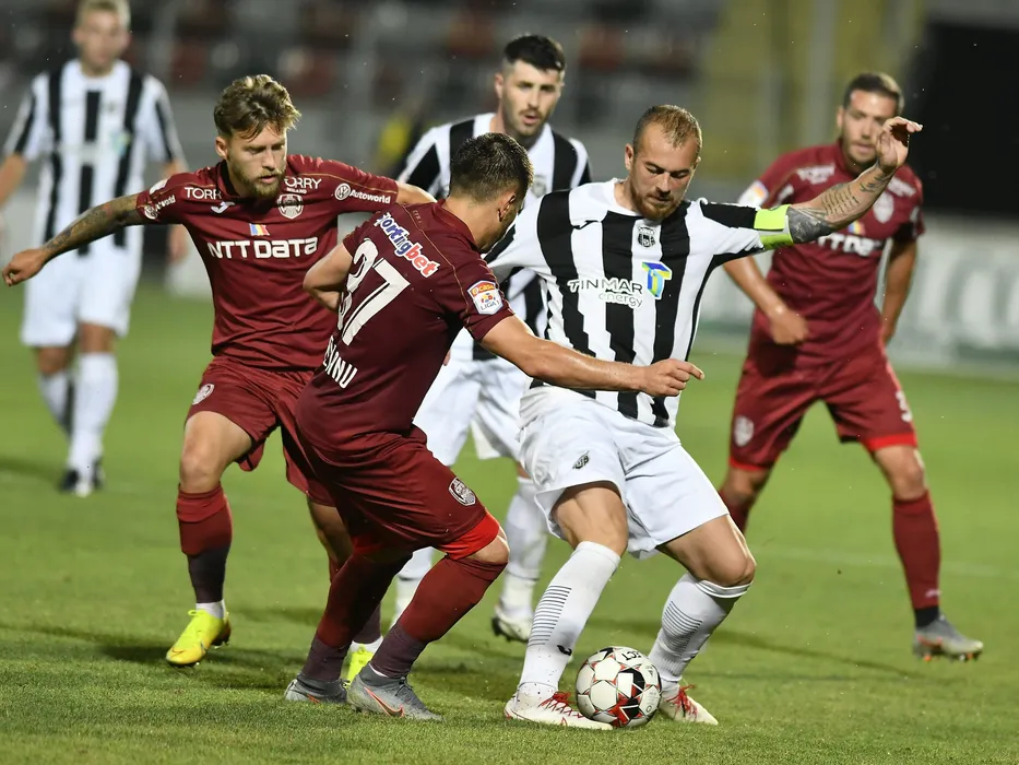 Catalin Golofca si Denis Alibec in meciul de fotbal dintre Astra Giurgiu si CFR Cluj, contand pentru play-off-ul Ligii 1 Casa Pariurilor, disputat fara spectatori pe Stadionul Marin Anastasovici din Giurgiu, duminica 5 iulie 2020. © FOTO:Razvan Pasarica/SPORT PICTURES