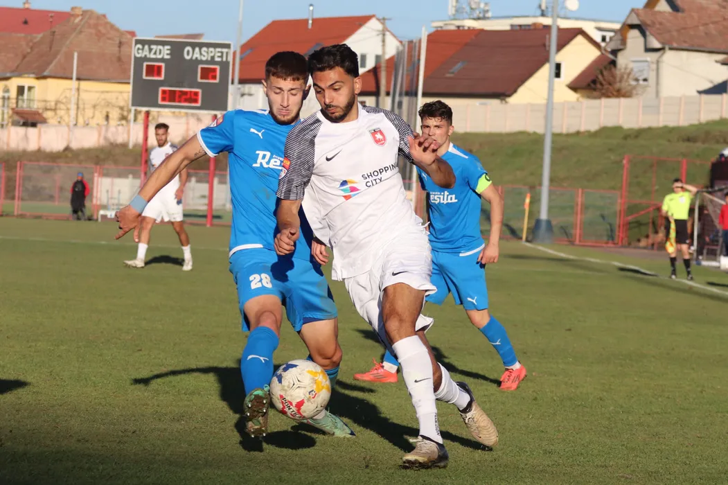 Robert Boboc și Salvatore Marrone în meciul de fotbal dintre CSC 1599 Șelimbăr și ACSM Reșița, contând pentru Liga 2 Casa Pariurilor, desfășurat pe Stadionul Măgura din Cisnădie, joi 7 noiembrie 2024. © FOTO: Valentin MACREA/SPORT PICTURES