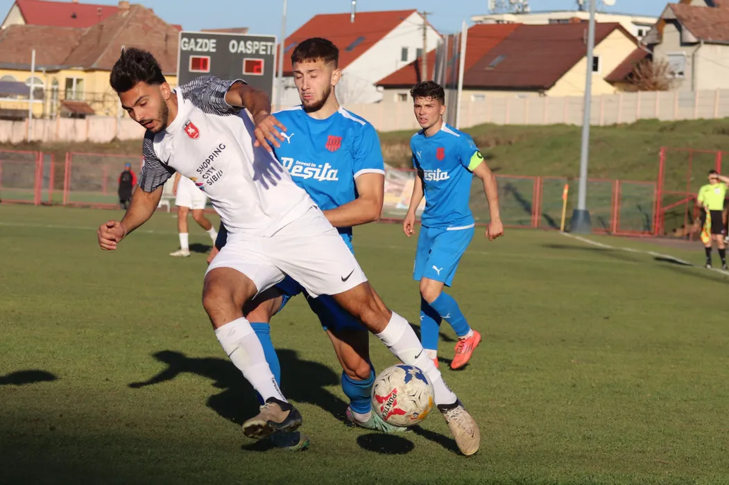 Salvatore Marrone și Mihai Dolghi în meciul de fotbal dintre CSC 1599 Șelimbăr și ACSM Reșița, contând pentru Liga 2 Casa Pariurilor, desfășurat pe Stadionul Măgura din Cisnădie, joi 7 noiembrie 2024. © FOTO: Valentin MACREA/SPORT PICTURES