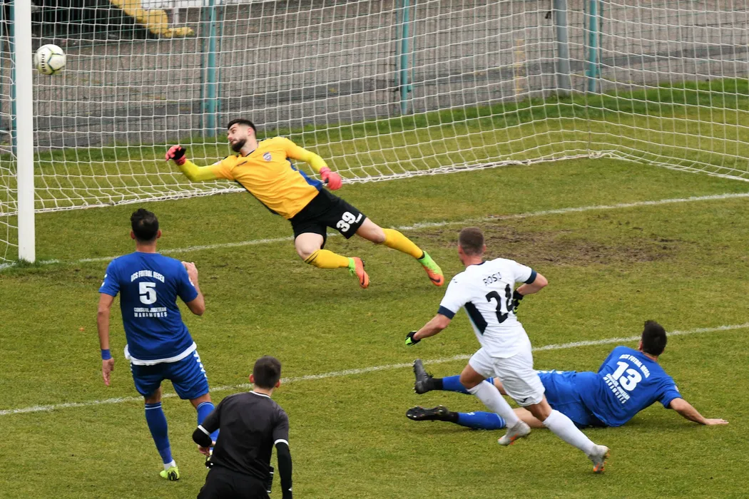 Iulian Rosu marcheaza un gol in poarta lui Dorian Railean de langa Ante Bakmaz in meciul de fotbal dintre SCM Gloria Buzau si ACS Fotbal Comuna Recea, contand pentru Liga a-2-a Casa Pariurilor, desfasurat fara spectatori pe Stadionul Gloria din Buzau, miercuri 18 noiembrie 2020. © FOTO:Adi Berger/SPORT PICTURES