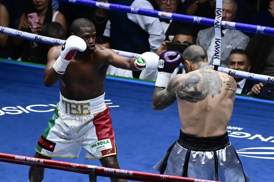 Boxer Floyd Mayweather Jr. of United States and boxer John Gotti III of United States exchange punches during an exhibition fight at Arena Ciudad de Mexico. Mexico City, Mexico, August 24, 2024. Photo by Carlos Tischler/Eyepix Group/ABACAPRESS.COM
