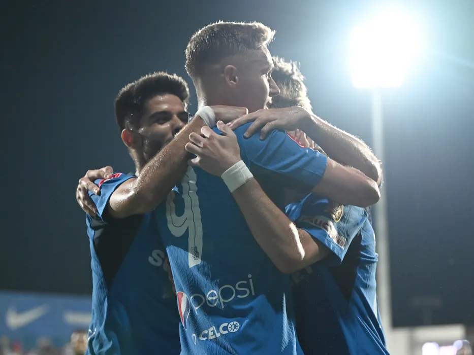 Louis Munteanu se bucura dupa un gol marcat alaturi de Ionut Daniel Vina in meciul de fotbal dintre Farul Constanta si Universitatea Craiova, contand pentru Superliga Superbet, desfasurat pe Stadionul central al Academiei Gheorghe Hagi din Ovidiu, duminica 27 august 2023. © FOTO:Razvan Pasarica/SPORT PICTURES