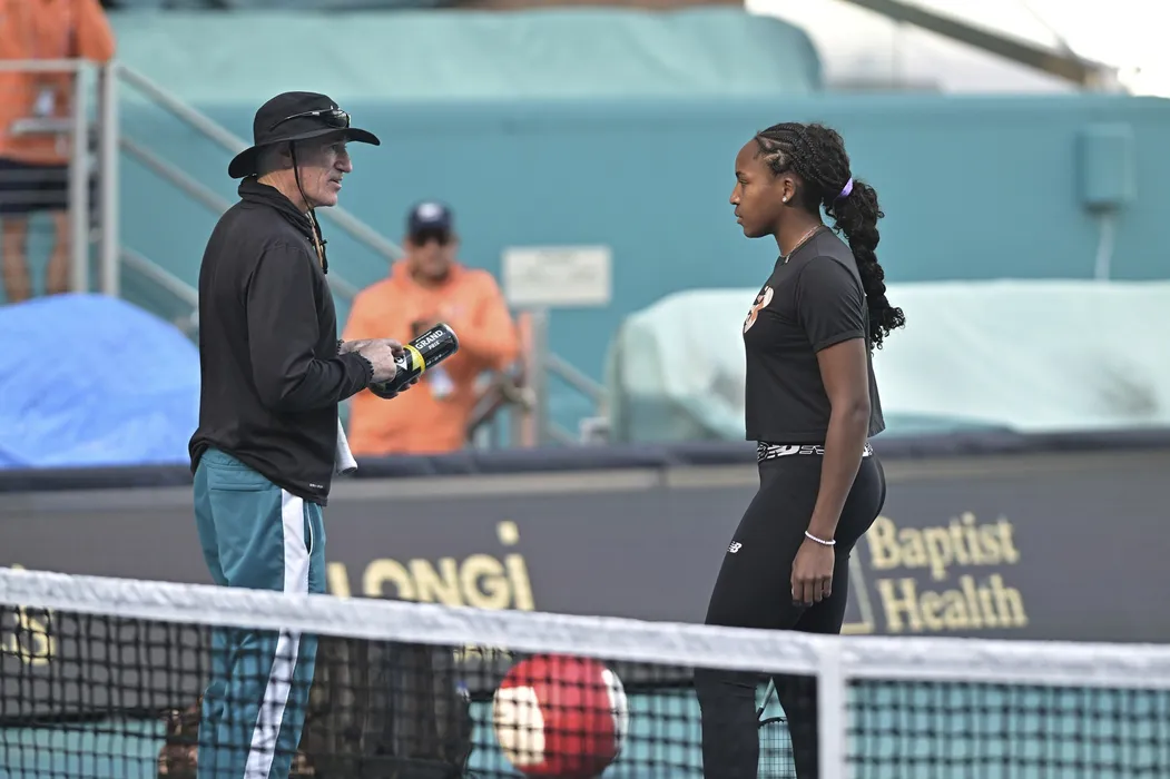 MIAMI GARDENS, FL - MARCH 19: Coach Brad Gilbert speaks with Coco Gauff (USA) during practice during the Miami Open on March 19, 2024, at Hard Rock Stadium in Miami Gardens, FL.,Image: 858131835, License: Rights-managed, Restrictions: This content is intended for editorial use only. For other uses, additional clearances may be required. FOR EDITORIAL USE ONLY. Icon Sportswire (A Division of XML Team Solutions) reserves the right to pursue unauthorized users of this image., Model Release: no, Pictured: Coco Gauff