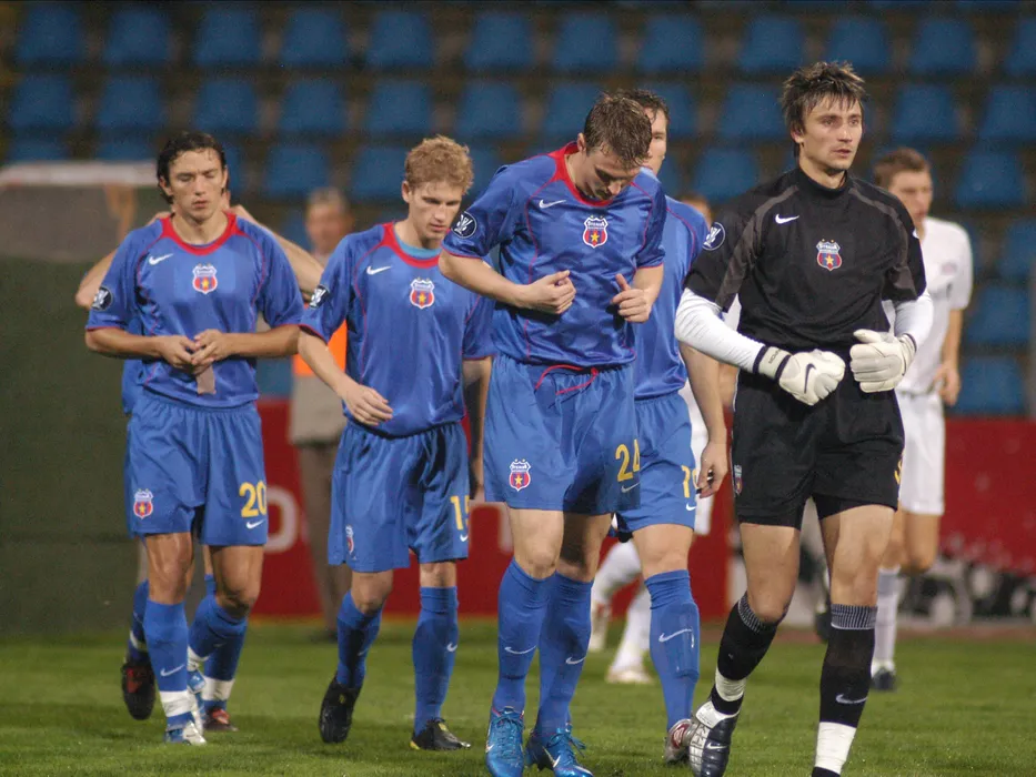 Sorin Ghionea si Vasili Hamutovski intra pe teren la meciul de fotbal dintre Steaua Bucuresti si Valerenga FC, contand pentru Cupa UEFA, disputat pe Stadionul Gheorghe Hagi din Constanta, joi 29 septembrie 2005. © FOTO:Razvan Pasarica/SPORT PICTURES