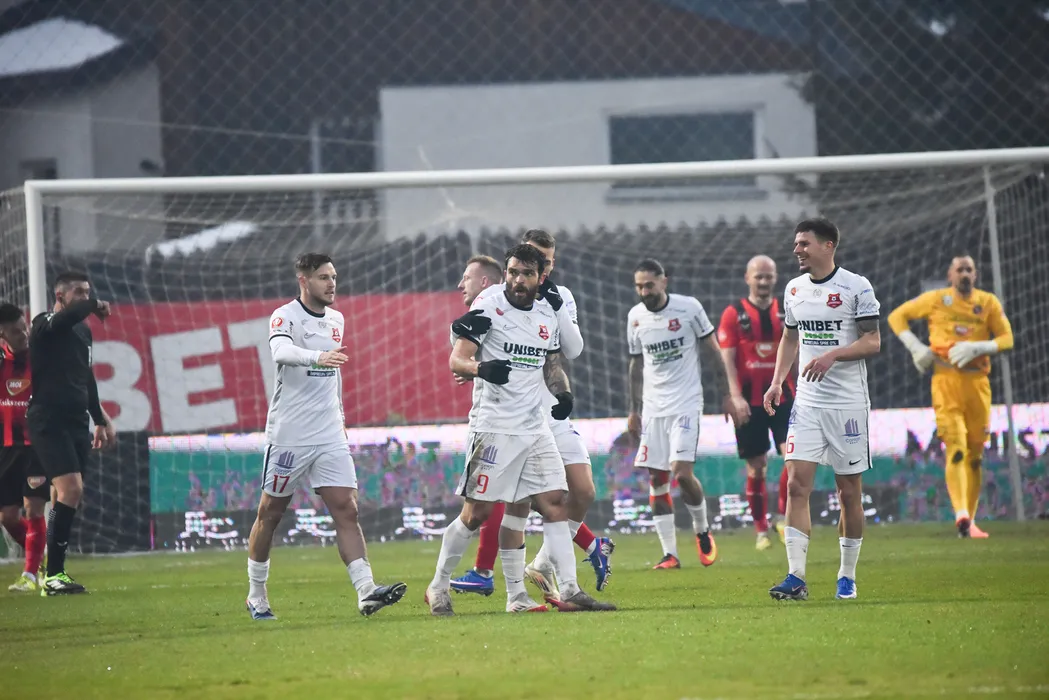 Fotbalistii sibieni se bucura dupa un gol marcat de Aurelian Ionut Chitu in meciul de fotbal dintre FK Csikszereda Miercurea Ciuc si AFC Hermannstadt Sibiu, contand pentru Superliga Superbet, desfasurat pe Stadionul Municipal din Miercurea Ciuc, luni 23 februarie 2026. © FOTO:Zoltan Pal/SPORT PICTURES