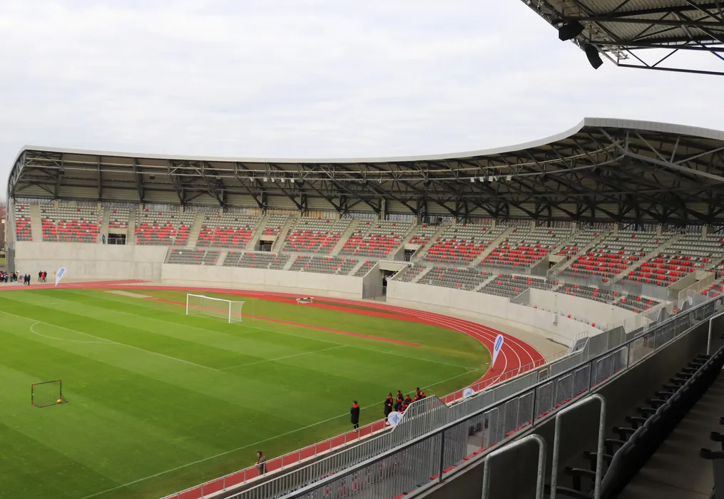 Stadionul Municipal din Sibiu a fost inaugurat in prezenta mai multor copii de la grupele de juniori ale celor de la Hermannstadt care au schimbat cateva pase iar primarul Astrid Fodor a sustinut o conferinta de presa in compania presedintelui FRF Razvan Burleanu, marti 06 decembrie 2022. © FOTO: Macrea Valentin/SPORT PICTURES