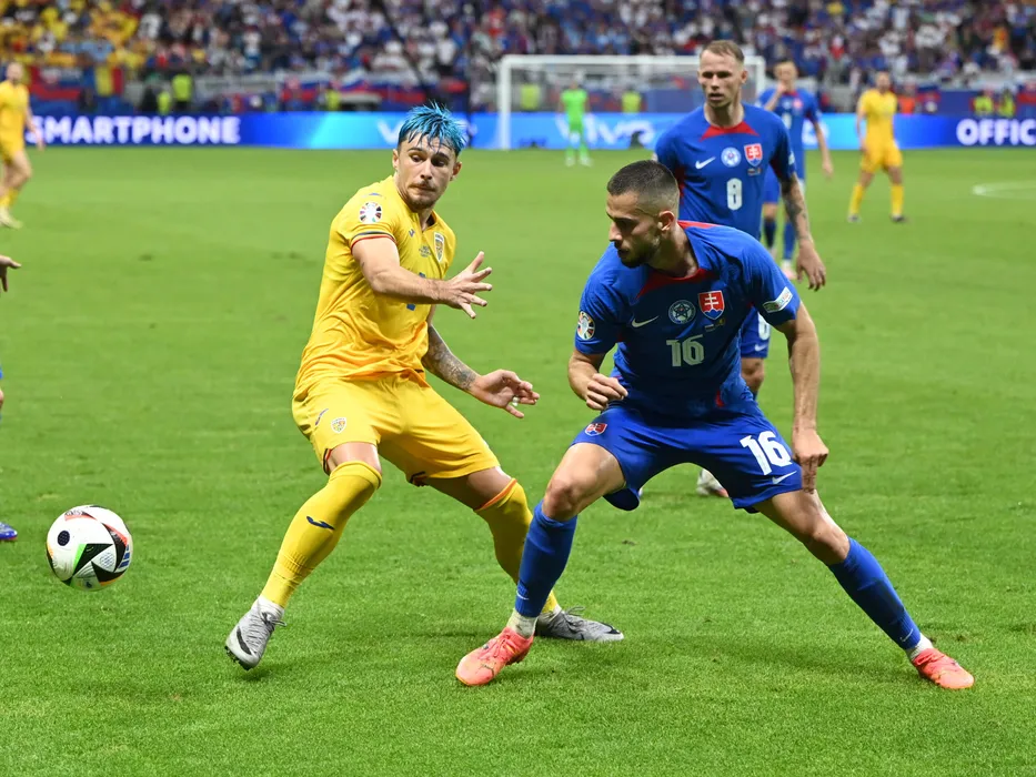 Andrei Rațiu si Dávid Hancko in meciul de fotbal dintre Slovacia si Romania, contand pentru UEFA EURO 2024, desfasurat pe Frankfurt Arena din Frankfurt, miercuri 26 iunie 2024. © FOTO:Razvan Pasarica/SPORT PICTURES