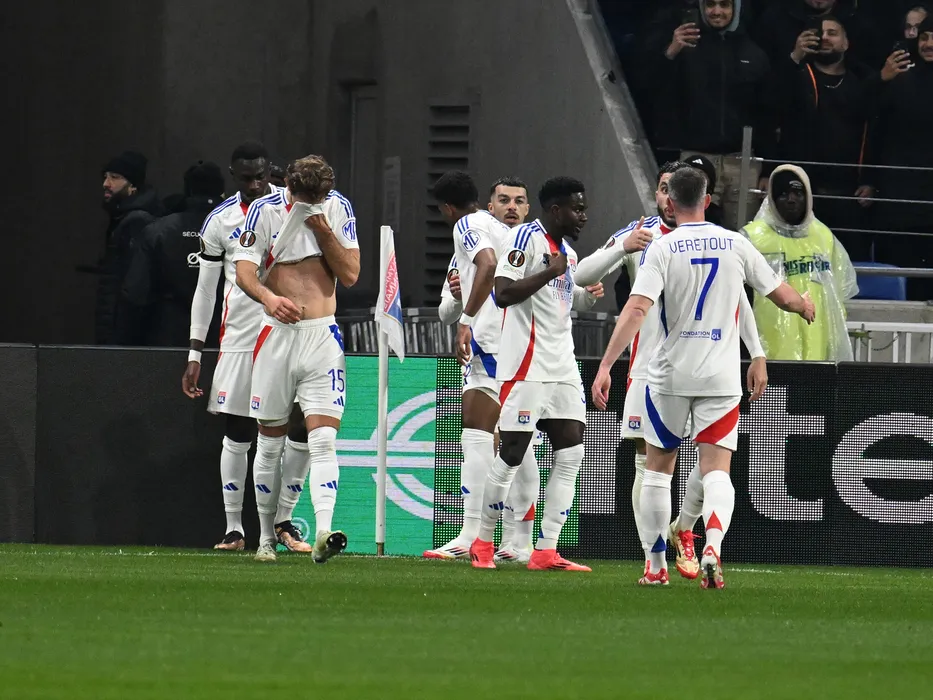 Bucurie a fotbaliștilor francezi Tanner Tessmann, Georges Mikautadze si Ernest Nuamah după un gol marcat in meciul de fotbal dintre Olympique Lyon si FCSB din cadrul UEFA Europa League, desfasurat pe Groupama Arena din Lyon, joi 13 martie 2025. © FOTO:Razvan Pasarica/SPORT PICTURES