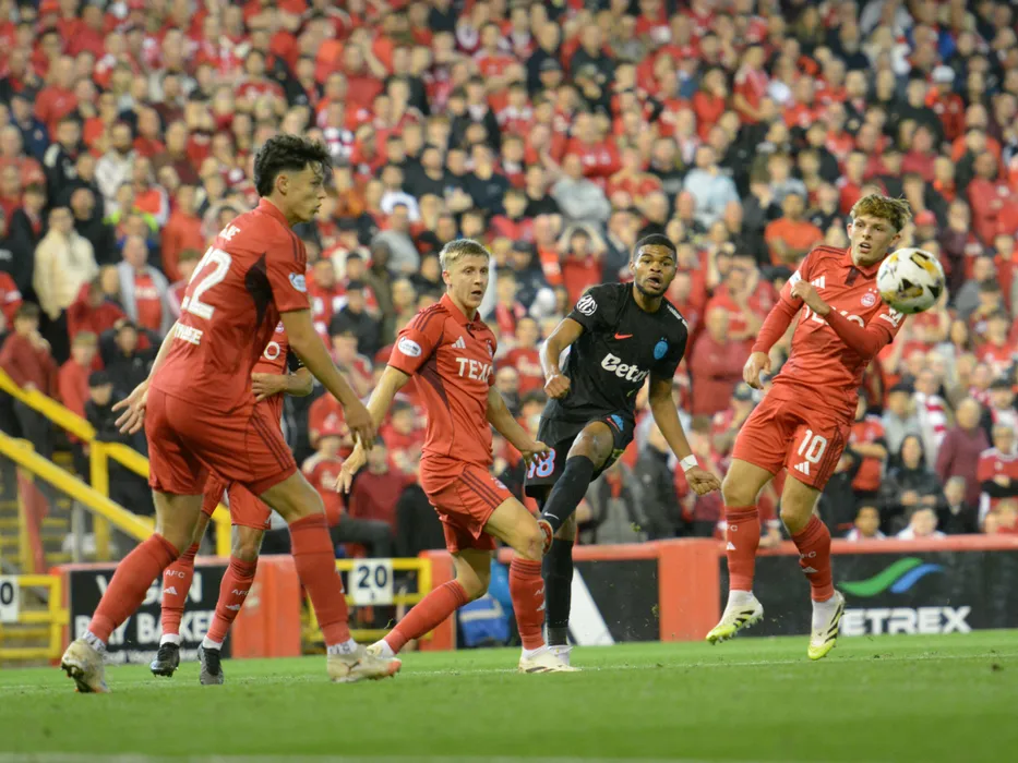 Jack Milne, Mats Knoester, Malcolm Edjouma si Leighton Clarkson in meciul de fotbal dintre FC Aberdeen si FCSB, contand pentru Play-Off UEFA Europa League, desfasurat pe Pittodrie Stadium din Aberdeen, joi 21 august 2025. © FOTO:Alexandra Cristina Grigorescu/SPORT PICTURES