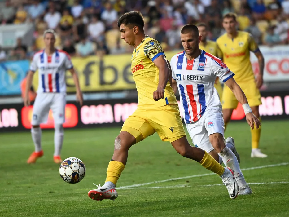 Alexandru Marian Musi si Milen Zhelev in meciul de fotbal dintre Petrolul Ploiesti si Otelul Galati, din cadrul Superligii Superbet, desfasurat pe Stadionul Ilie Oana din Ploiesti, vineri 1 septembrie 2023. © FOTO:Razvan Pasarica/SPORT PICTURES
