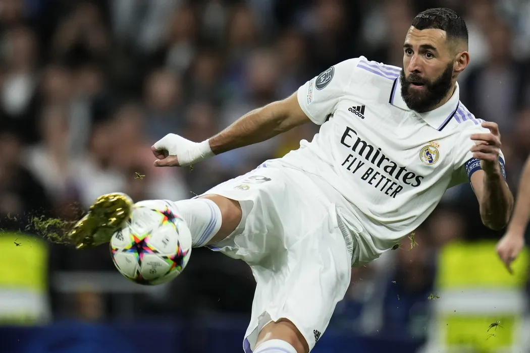 Real Madrid's Karim Benzema kicks the ball during the Champions League Group F soccer match between Real Madrid and Celtic at the Santiago Bernabeu stadium in Madrid, Spain, Wednesday, Nov. 2, 2022. (AP Photo/Manu Fernandez)