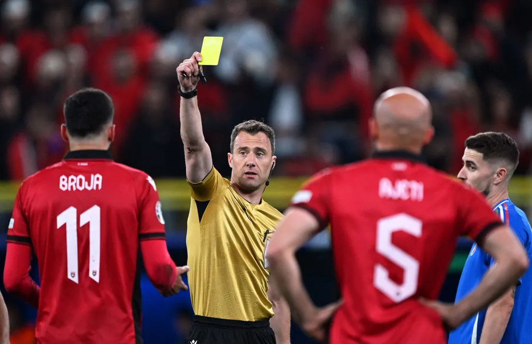 15 June 2024, North Rhine-Westphalia, Dortmund: German Referee Felix Zwayer (C) shows Albania's Armando Broja (L) a yellow card during the UEFA Euro 2024 group B soccer match between Italy and Albania at the Dortmund stadium. Photo: Bernd Thissen/dpa/HEPTA/SPORT PICTURES