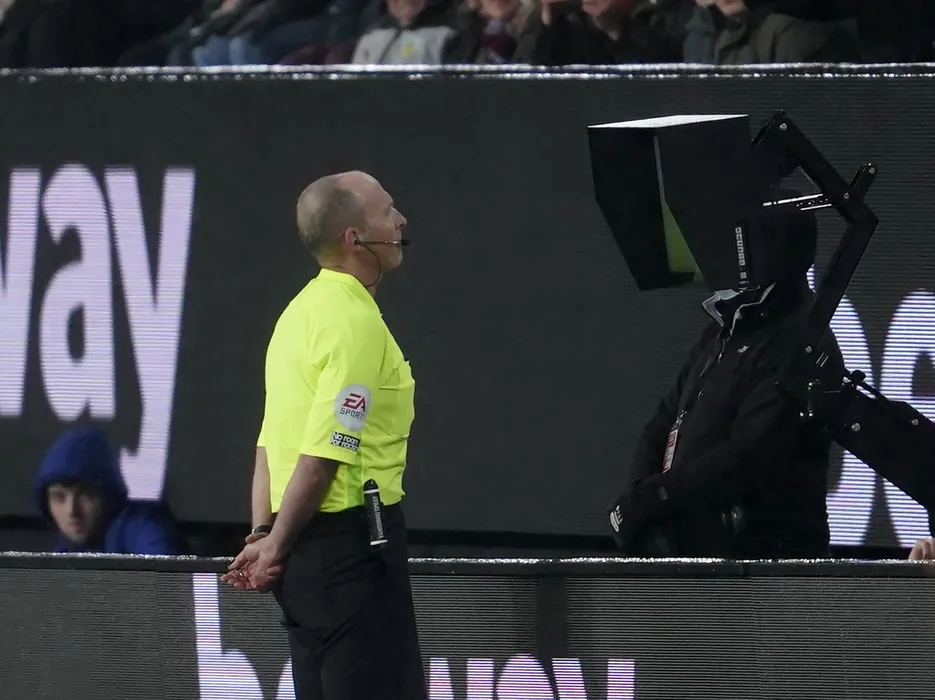 Referee Mike Dean checks the VAR screen during the English Premier League soccer match between Burnley and Manchester United at Turf Moor, in Burnley, England, Tuesday, Feb. 8, 2022. (AP Photo/Jon Super)