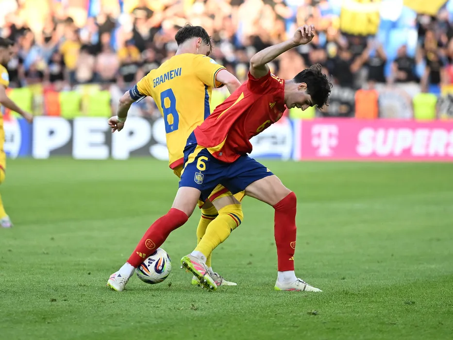 Constantin Grameni si Javi Guerra in meciul de fotbal dintre Spania U21 si Romania U21, din cadrul UEFA EURO U21 din Slovacia, desfasurat pe Stadionul National de fotbal din Bratislava, sambata 14 iunie 2025. © FOTO:Razvan Pasarica/SPORT PICTURES