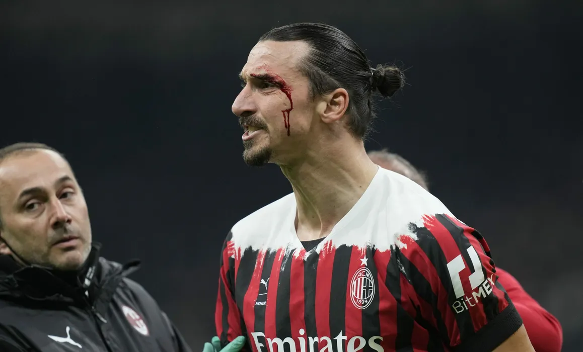 AC Milan's Zlatan Ibrahimovic reacts being injured from a header during the Serie A soccer match between AC Milan and Bologna at the San Siro stadium, in Milan, Italy, Monday, April 4, 2022. (AP Photo/Antonio Calanni)