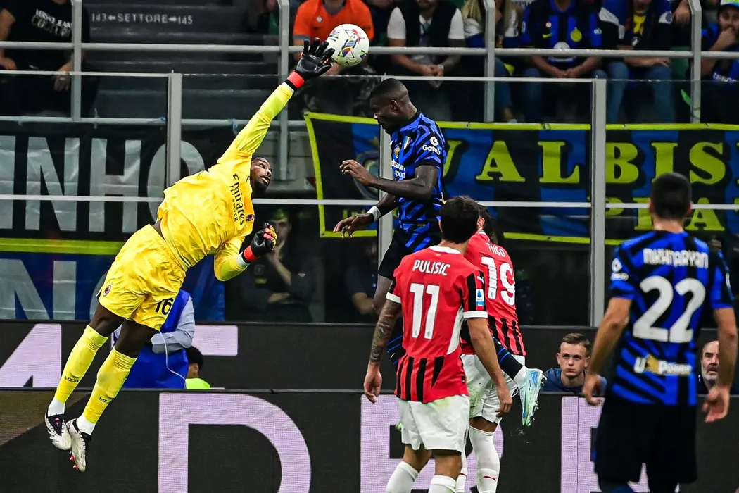 MILAN, ITALY - SEPTEMBER 22: AC Milan's Mike Maignan fights for the ball with Inter Milan's Marcus Thuram during the Italian Serie A football match Inter Milan and AC Milan at San Siro Stadium in Milan, Italy on September 22, 2024 Piero Cruciatti / Anadolu/ABACAPRESS.COM,Image: 910809622, License: Rights-managed, Restrictions: , Model Release: no