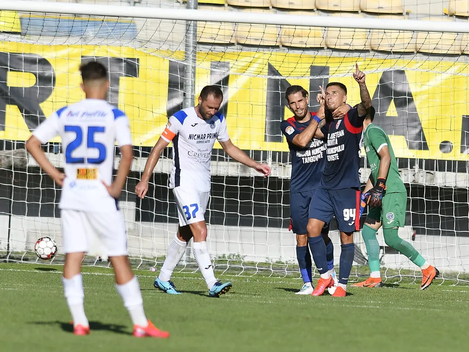 Ovidiu Alexandru Bic se bucura dupa un gol marcat alaturi de Daniel Constantin Florea spre dezamagirea lui Eugeniu Cebotaru in meciul de fotbal dintre Chindia Targoviste si Academica Clinceni, contand pentru play-out-ul Ligii 1 Casa Pariurilor, disputat fara spectatori pe Stadionul Ilie Oana din Ploiesti, miercuri 29 iulie 2020. © FOTO:Razvan Pasarica/SPORT PICTURES