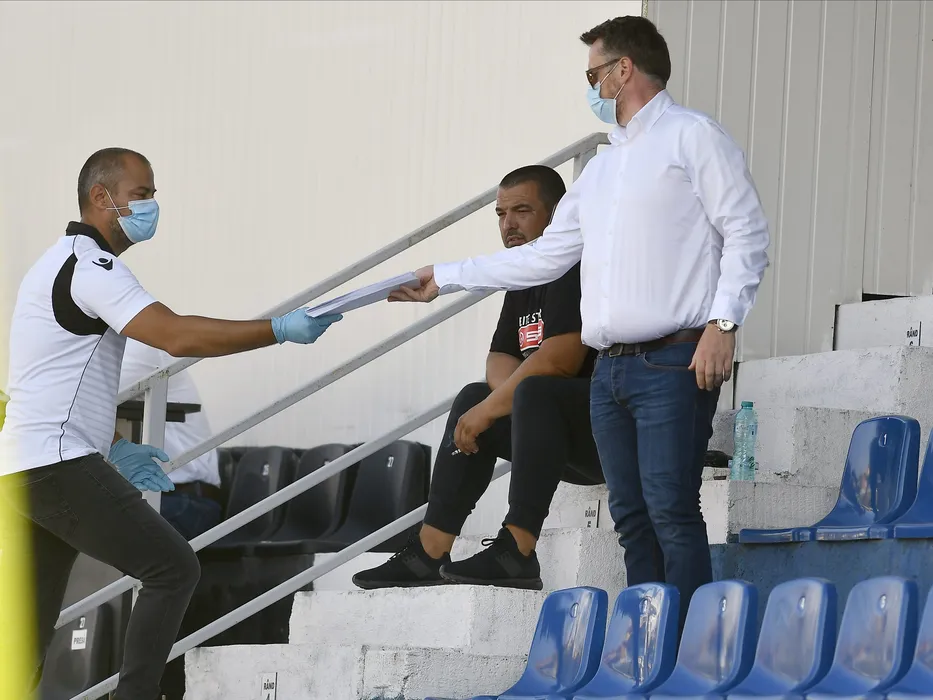Observatorul de joc Constantin Statescu primeste foile cu declaratiile pe proprie raspundere ai celor impicati la meciul de fotbal dintre Academica Clinceni si Dinamo Bucuresti, contand pentru play-out-ul Ligii 1 Casa Pariurilor, disputat pe Clinceni Arena din Clinceni, duminica 5 iulie 2020. © FOTO:Razvan Pasarica/SPORT PICTURES