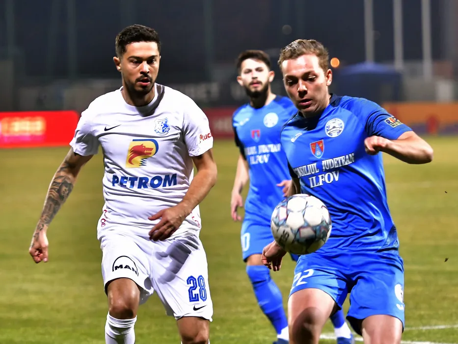 Gabriel Cristian Iancu si Alexandru Luca Florica in meciul de fotbal dintre Academica Clinceni si Farul Constanta, restanta contand pentru Liga 1 Casa Pariurilor, desfasurat pe Stadionul Marin Anastasovici din Giurgiu, joi 17 februarie 2022. © FOTO:Razvan Pasarica/SPORT PICTURES