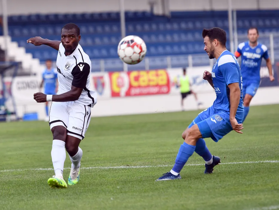 Moussa Sanoh si Mihai Dobrescu in meciul de fotbal dintre Academica Clinceni si FC Voluntari, contand pentru play-out-ul Ligii 1 Casa Pariurilor, disputat pe Clinceni Arena din Clinceni, vineri 17 iulie 2020. © FOTO:Razvan Pasarica/SPORT PICTURES