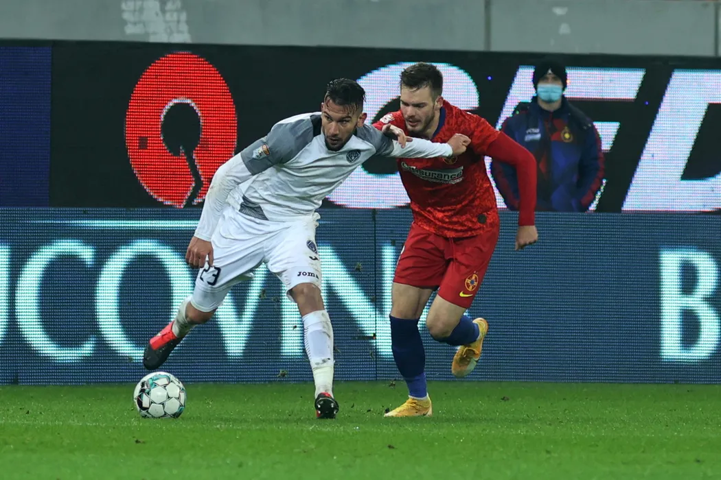 Denis Harut (D), de la FCSB, lupta pentru balon cu Tsvetelin Chunchukov (D), de la Academica Clinceni, in meciul de fotbal din etapa a XXII-a a Ligii 1, disputat pe Arena Nationala din Bucuresti, duminica, 7 februarie 2021. GEORGE FILIP / MEDIAFAX FOTO