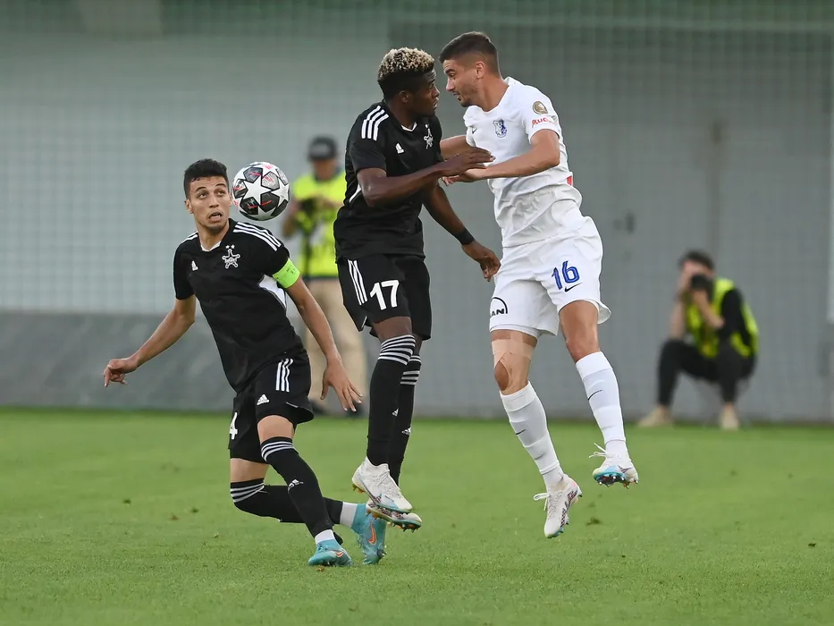 Amine Talal, Jerome Ngom Mbekeli si Dragos Ionut Nedelcuin meciul de fotbal dintre FC Sferiff Tiraspol si FCV Farul Constanta, din cadrul Preliminariilor Ligii Campionilor, desfasurat pe Stadionul Sheriff din Tiraspol, marti 18 iulie 2023. © FOTO:Razvan Pasarica/SPORT PICTURES