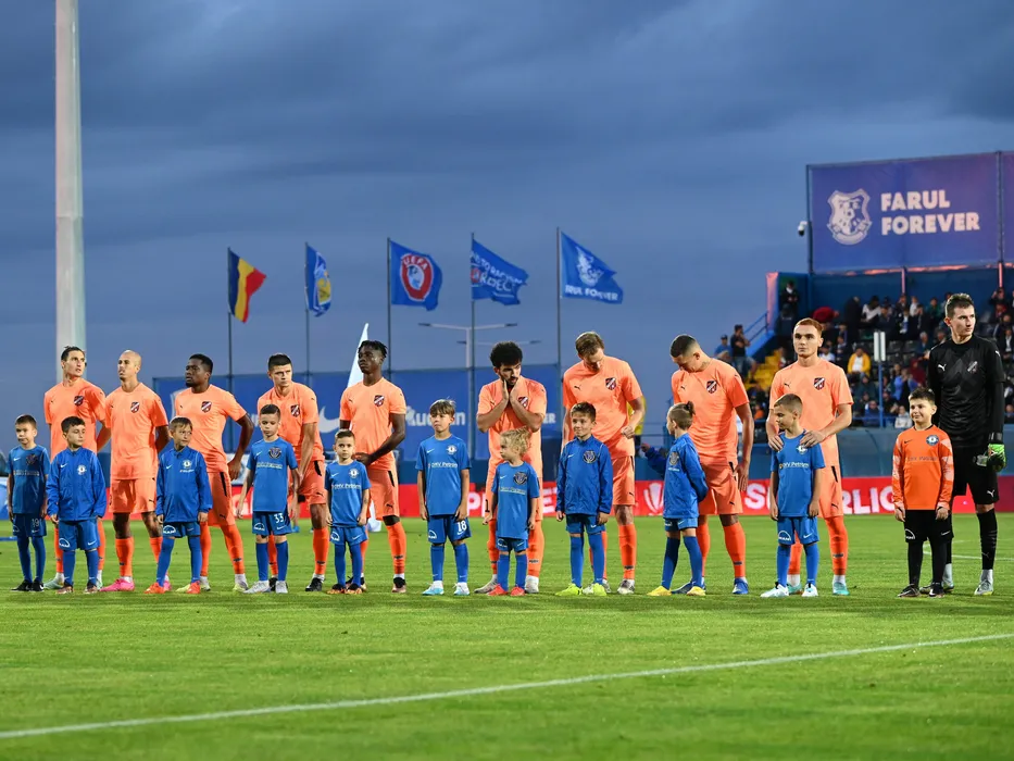Fotbalistii armeni la startul meciului de fotbal dintre Farul Constanta si FC Urartu, contand pentru UEFA Europa Conference League, desfasurat pe Stadionul central al Academiei Gheorghe Hagi din Ovidiu, joi 27 iulie 2023. © FOTO:Razvan Pasarica/SPORT PICTURES