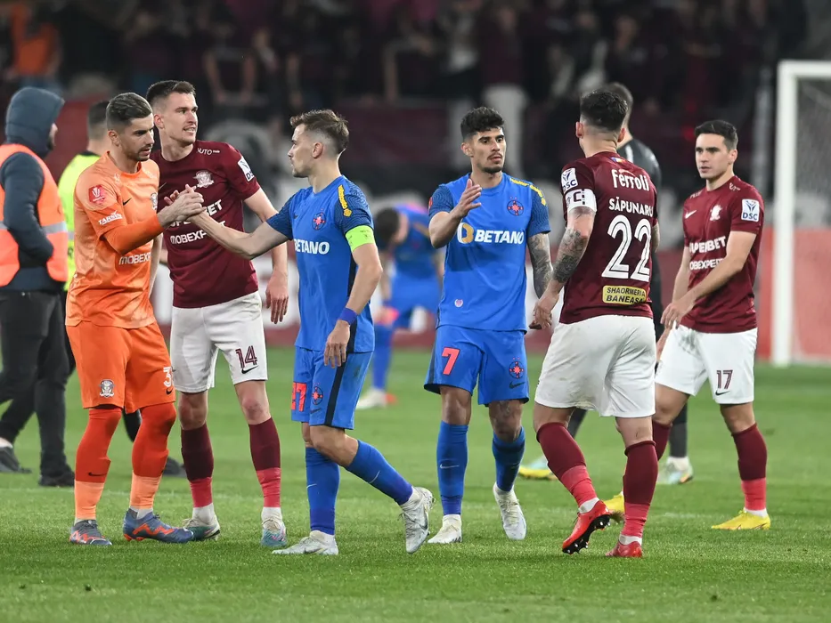 Jucatorii celor doua echipe Horatiu Alexandru Moldovan,Mattias Kait,Darius Dumitru Olaru, Florinel Teodor Coman, Cristian Ionut Sapunaru si Stefan Calin Panoiuse saluta dupa meciul de fotbal dintre Rapid Bucuresti si FCSB, contand pentru Play-off-ul Superligii Superbet, desfasurat pe Stadionul Rapid Giulesti din Bucuresti, duminica 23 aprilie 2023. © FOTO:Razvan Pasarica/SPORT PICTURES