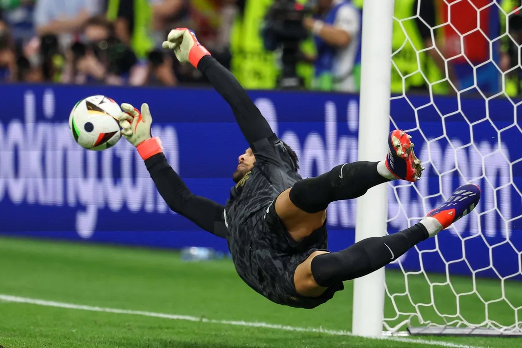 Frankfurt Arena Frankfurt am Main, UEFA EURO, EM, Europameisterschaft,Fussball 2024 Germany, Monday 1 Jul 2024 Round of 16, Portugal - Slovenia, goalkeeper, Torwart Diogo Costa Portugal hält den 2.Elfmeter *** Frankfurt Arena Frankfurt am Main, UEFA EURO 2024 Germany, Monday 1 Jul 2024 Round of 16, Portugal Slovenia, goalkeeper, Goalkeeper Diogo Costa Portugal saves the 2 penalty kicks Copyright: JoaquimxFerreira,Image: 886447146, License: Rights-managed, Restrictions: Credit images as "Profimedia/ IMAGO", Model Release: no
