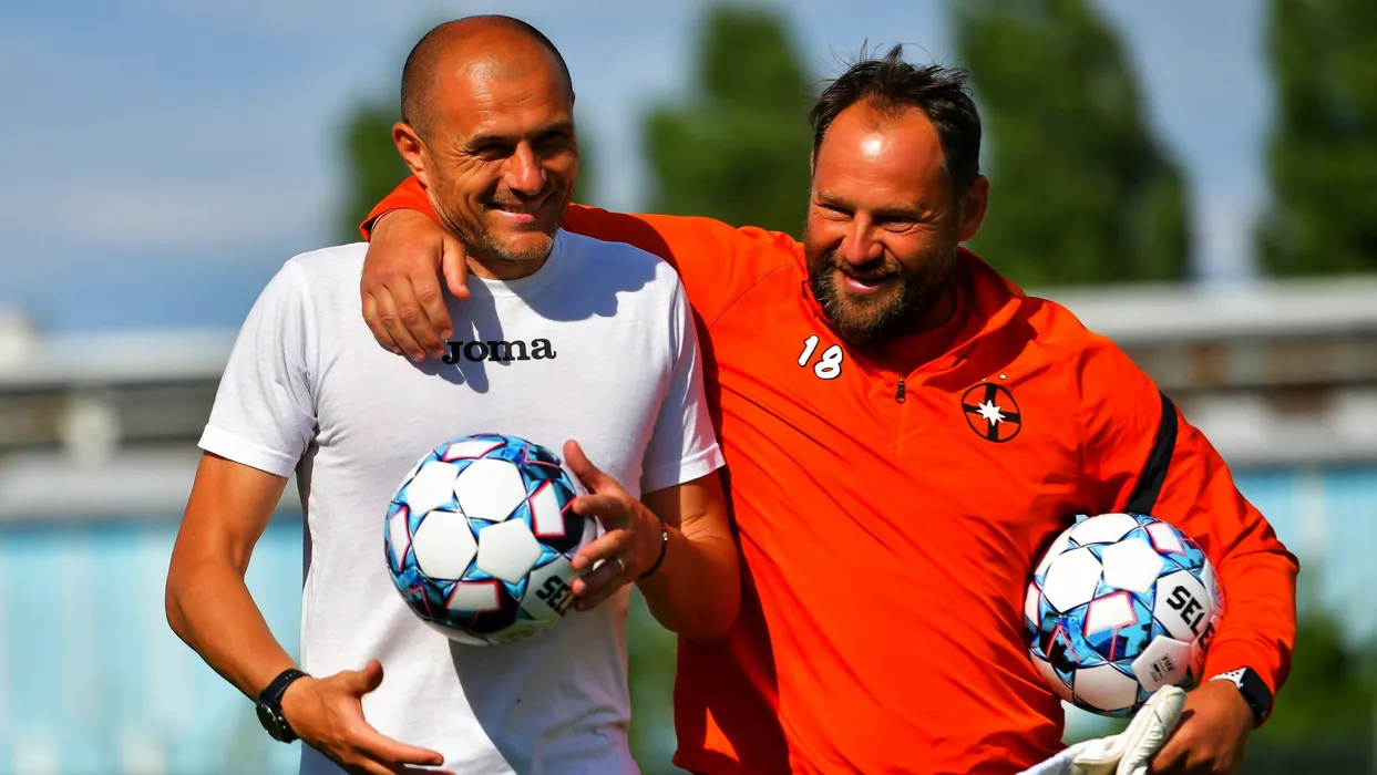 Dumitru Hotoboc si Marius Popa discuta la meciul amical de fotbal dintre FCSB si Chindia Targoviste, disputat la Baza de antrenament FCSB din Bucuresti-Berceni, sambata 3 iulie 2021. © FOTO:Razvan Pasarica/SPORT PICTURES