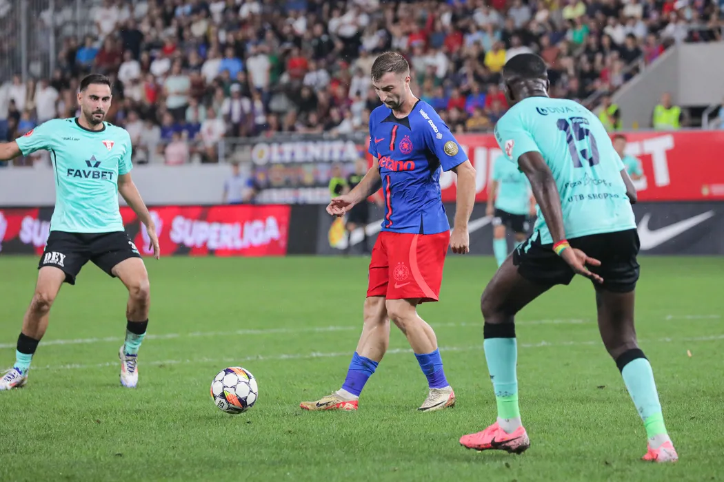 Iliuță Daniel Popa și Benjamin Andre P Van Durmen în meciul de fotbal dintre FCSB și UTA Arad, contând pentru Superliga Superbet, desfășurat pe Stadionul Arcul de Triumf din București, duminică 1 septembrie 2024. © FOTO: Mihai Antonio VASILE/SPORT PICTURES