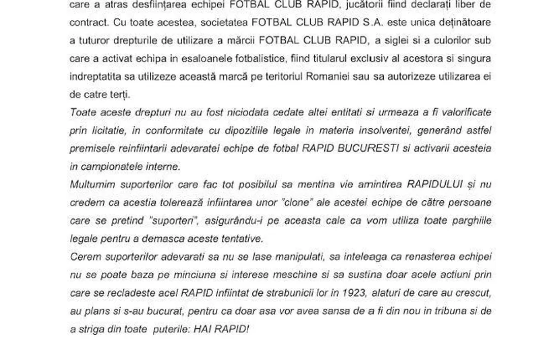 ACTE | FC Rapid intră în război cu AFC Rapid. Lichidatorul judiciar Mihai Florea: „Nu credem că suporterii tolerează înființarea unor clone. Vom utiliza toate pârghiile pentru a demasca aceste tentative”. Notificări către toate instituțiile. Ce urmează