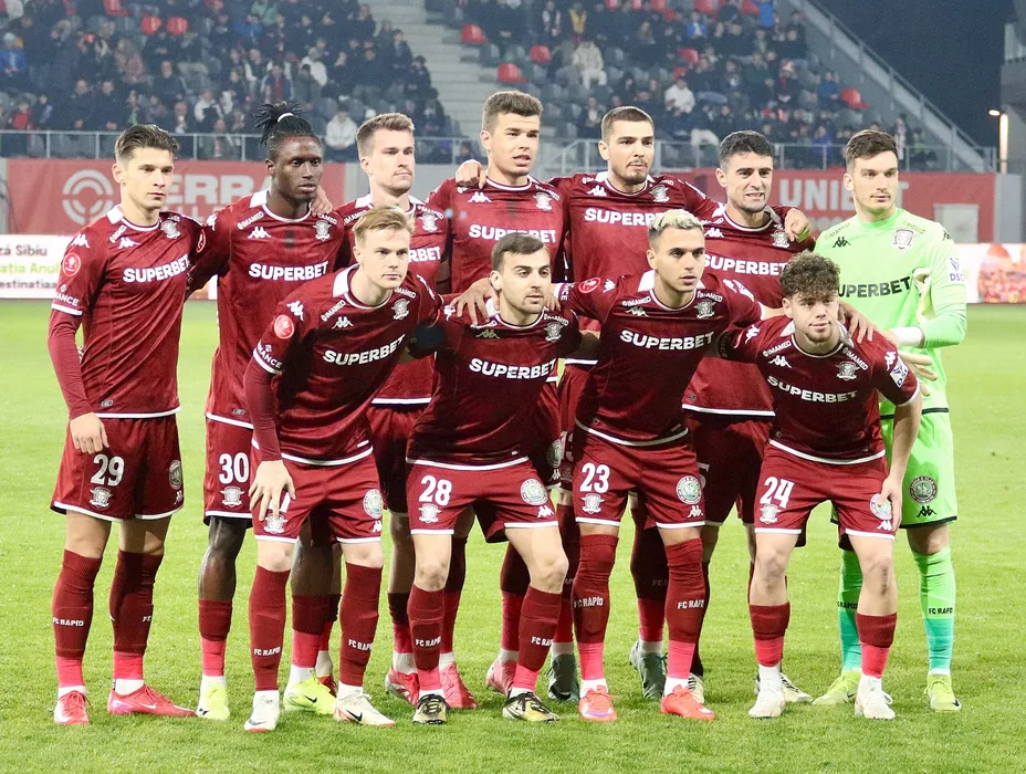 Fotbalistii rapidisti la o fotografie de grup realizata inaintea meciului de fotbal dintre AFC Hermannstadt Sibiu si FC Rapid 1923 bucuresti, contand petru Superliga Superbet, desfasurat pe Stadionul Municipal din Sibiu, vineri 8 martie 2025. © FOTO: Valentin Macrea/SPORT PICTURES