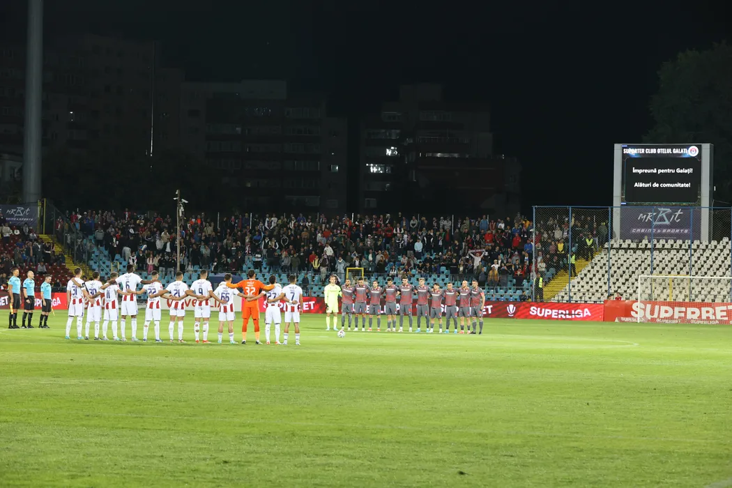 Jucătorii celor două echipe păstrează un moment de reculegere înaintea meciului de fotbal dintre SC Oțelul Galați si Dinamo Biucurești, contând pentru Superliga Superbet, desfășurat pe Stadionul Oțelul din Galați, vineri 20 septembrie 2024. © FOTO: Sorin PANĂ/SPORT PICTURES