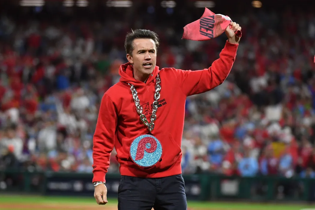 Oct 17, 2023; Philadelphia, Pennsylvania, USA; Actor Rob McElhenney reacts during the sixth inning for game two of the NLCS for the 2023 MLB playoffs between the Philadelphia Phillies and Arizona Diamondbacks at Citizens Bank Park.,Image: 814606022, License: Rights-managed, Restrictions: *** World Rights ***, Model Release: no
