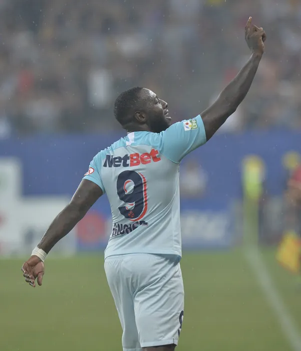Harlem Gnohere reactioneaza dupa inscrierea unui gol in meciul de fotbal dintre FC Steaua Bucuresti si Dinamo Bucuresti, din etapa a II-a a Ligii 1, disputat pe Arena Nationala din Bucuresti, duminica, 29 iulie 2018.© FOTO: Sport Pictures