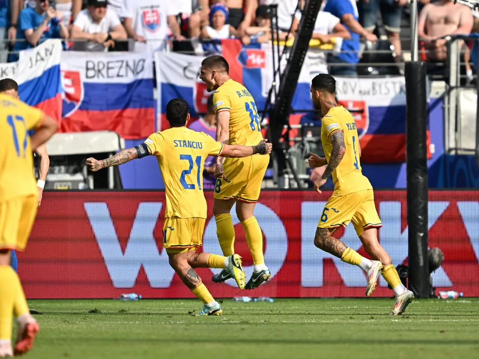 Bucurie a fotbalistilor romani Nicolae Stanciu, Răzvan Marin si Marius Marin dupa un gol marcat in meciul de fotbal dintre Slovacia si Romania, contand pentru UEFA EURO 2024, desfasurat pe Frankfurt Arena din Frankfurt, miercuri 26 iunie 2024. © FOTO:Razvan Pasarica/SPORT PICTURES