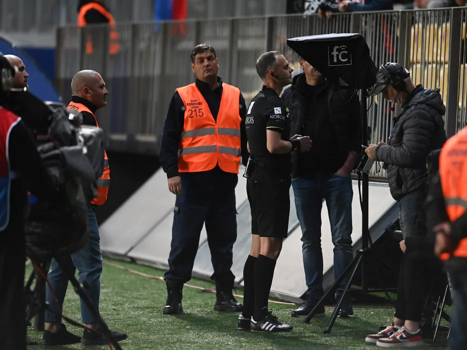 Arbitrul central Lucian Rusandu consulta VAR-ul in meciul de fotbal dintre Chindia Targoviste si Rapid Bucuresti, contand pentru Superliga Superbet, desfasurat pe Stadionul Ilie Oana din Ploiesti, luni 3 octombrie 2022. © FOTO:Razvan Pasarica/SPORT PICTURES