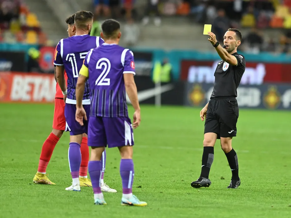 Arbitrul central George Catalin Gaman acorda un cartonas galben in meciul de fotbal dintre FCSB si FC Arges, contand pentru Superliga Superbet, desfasurat pe Arena Nationala din Bucuresti, duminica 2 octombrie 2022. © FOTO:Razvan Pasarica/SPORT PICTURES