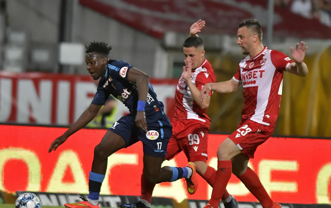 Philip Porwei Otele, Antoni Valeri Ivanov si Nichita Razvan Bogdan Patriche in meciul de fotbal dintre Dinamo Bucuresti si UTA Arad, contand pentru Play-out-ul Ligii 1 Casa Pariurilor, desfasurat pe Stadionul Dinamo din Bucuresti, vineri 13 mai 2022. © FOTO:Razvan Pasarica/SPORT PICTURES