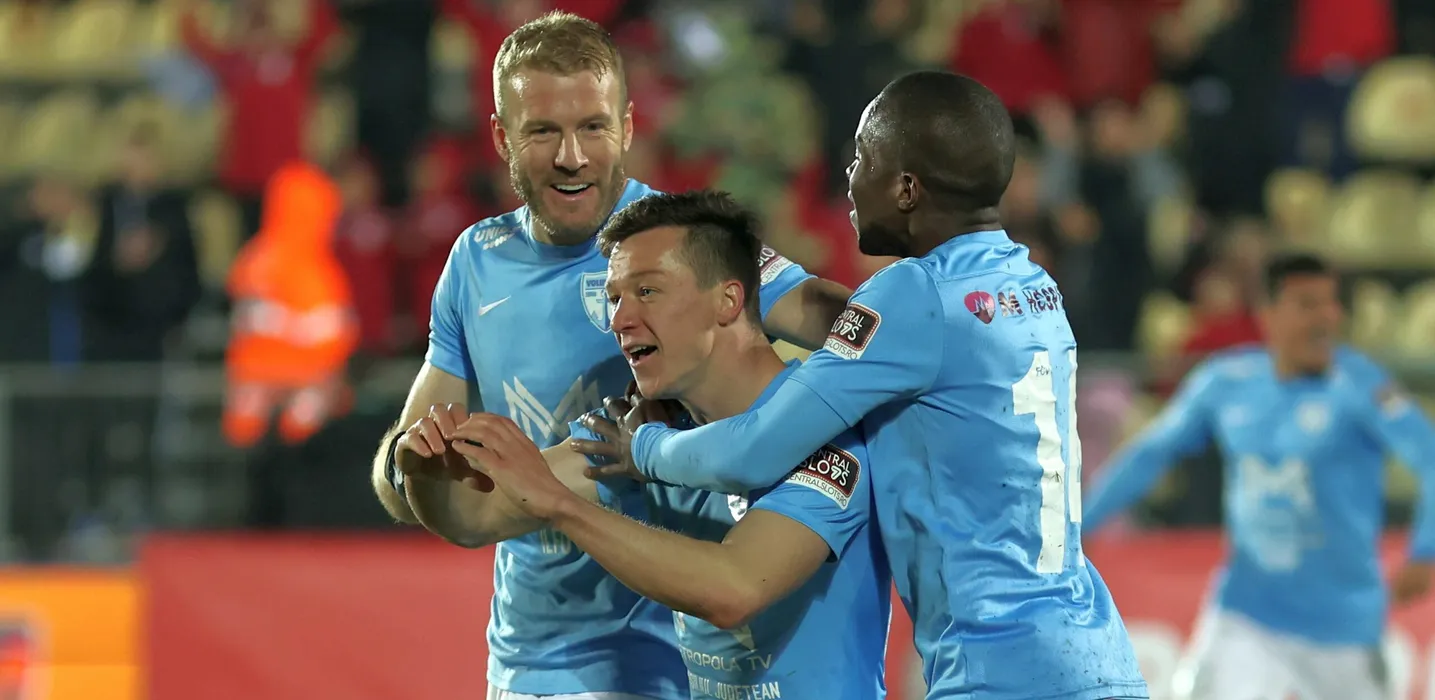 Bucurie a fotbalistilor voluntareni dupa un gol marcat cu Adam Nemec, Vadim Rata si Marcelo Andre Da Veiga Lopes in meciul de fotbal dintre FC Voluntari si FC Arges, contand pentru Cupa Romaniei, desfasurat pe Stadionul Anghel Iordanescu din Voluntari, marti 19 aprilie 2022. © FOTO:Gheorghe Fluster/SPORT PICTURES