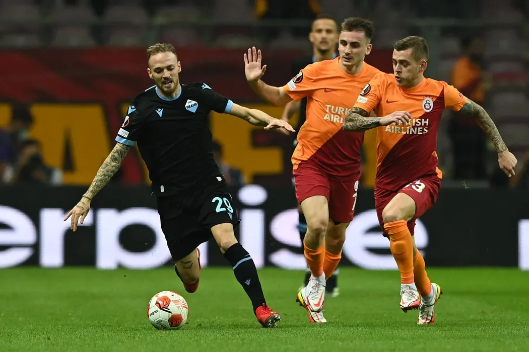 Lazio's Manuel Lazzari (L) fights for the ball with Galatasaray's Alexandru Cicâldău (R) and Kerem Akturkoglu (C) during the UEFA Europa League group E football match between Galatasaray and Lazio at Turk Telekom Stadium in Istanbul on September 16, 2021.,Image: 632492335, License: Rights-managed, Restrictions: , Model Release: no, Credit line: Profimedia